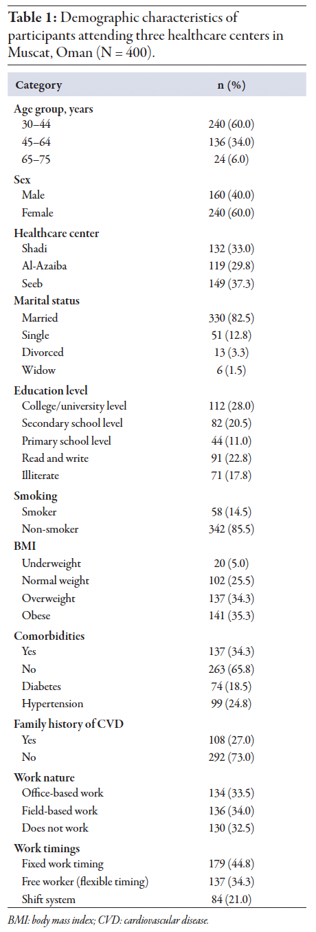 Our study analyzed data from 400 individuals across three healthcare centers: Shadi (33.0%), Al-Azaiba (29.8%), and Seeb (37.3%). Most (60.0%) participants were female, non-smokers (85.5%), and married (82.5%). The majority (81.5%) of participants did not have diabetes, 75.3% were not undergoing hypertension treatment, and 65.8% had no comorbid conditions. Educational status among the participants varied with 28.0% having a college or university-level education and 17.8% being illiterate. Occupationally, participants were almost equally split among office-based work (33.5%), field-based work (34.0%), and non-working (32.5%). Almost half (44.8%) worked regular fixed office hours, while 34.3% had flexible work timings and 21.0% worked shifts, reflecting diverse working conditions. In terms of age, 60.0% were aged 30–44 years, 34.0% were aged 45–64 years old, and 6.0% were aged 65–75 years old. The mean BMI was 29.1 ± 6.4, indicating an overweight population, with 34.3% categorized as overweight and 35.3% as obese. The average systolic blood pressure was 126.9 ± 14.0 mmHg [Table 1].