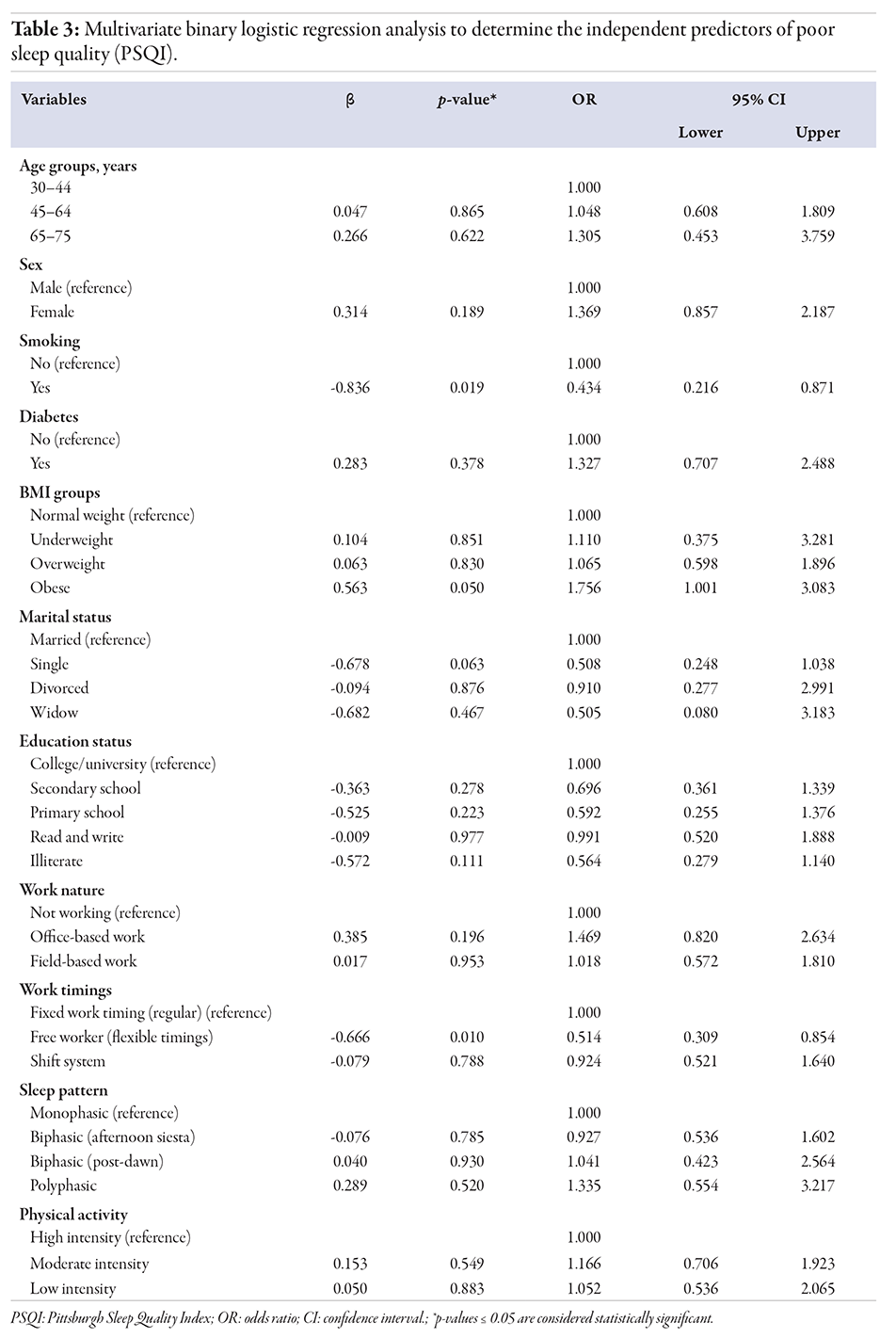 BMI and work timings emerged as significant independent predictors of sleep quality. Obese participants had a 75.6% higher risk of poor sleep quality compared to those with normal weight (OR = 1.756, 95% CI: 1.001–3.083; p = 0.050) [Figure 2].