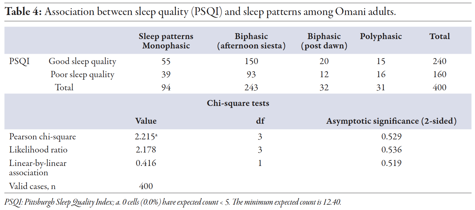 Sleep patterns are generally categorized into three types: monophasic, biphasic, and polyphasic.12 Monophasic sleep consists of a single nighttime sleep period; biphasic sleep includes a longer nighttime sleep and a short daytime nap; and polyphasic sleep involves multiple sleep periods throughout the day.12 Arab Muslims often exhibit distinct sleep patterns due to five daily prayers, with the first at dawn, thereby dividing nighttime sleep into two segments.13 Furthermore, a recent study conducted in Oman identified four distinct sleep patterns: monophasic, biphasic (post-dawn), biphasic (afternoon siesta), and polyphasic.3 The study found that the most prevalent sleep pattern among participants was biphasic (afternoon siesta), followed by polyphasic, monophasic, and biphasic (post-dawn).3 There is a lack of research investigating the association between sleep patterns, sleep quality, and CVD risk in some areas of the world, particularly in Muslim Middle Eastern societies, such as Oman, where habitual sleep behavior differs significantly from that in Western societies. While numerous studies have suggested an association between sleep quality, sleep duration, and CVD risk, few have explored this relationship within Arab Muslim societies, considering the distinct sleep patterns typically adopted in this region.