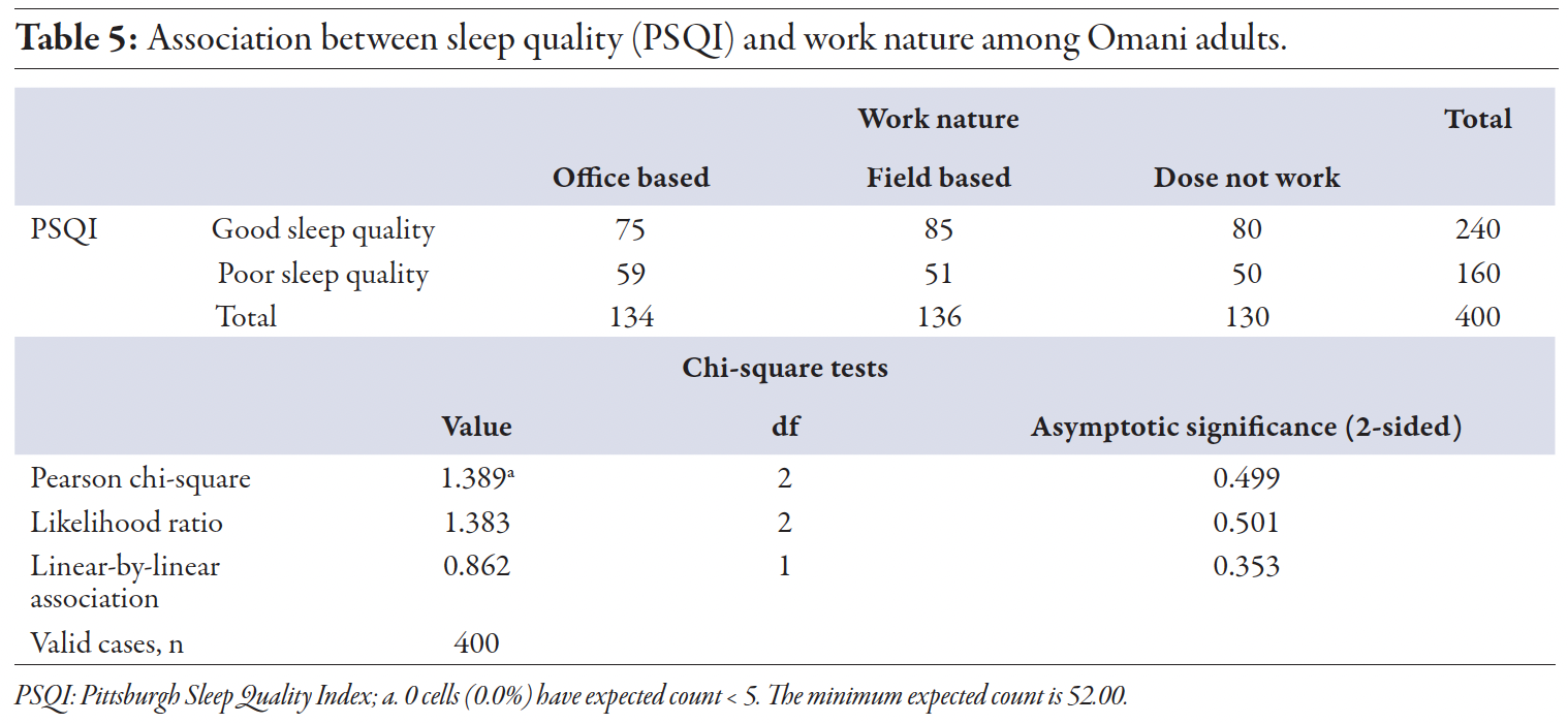 Our study did not find a significant association between sleep quality and work nature (office-based or field-based; p = 0.499) [Table 5]. This is consistent with findings from Kuwait, which showed no differences in sleep quality between desk and non-desk jobs.14 These findings suggest that other factors, such as work schedule flexibility and individual health behaviors, may be more influential in determining sleep quality than the physical nature of one’s work.