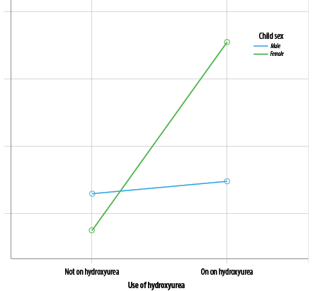 Figure 1: Three-way interactions between sex, hydroxyurea, and health related quality of life scores.