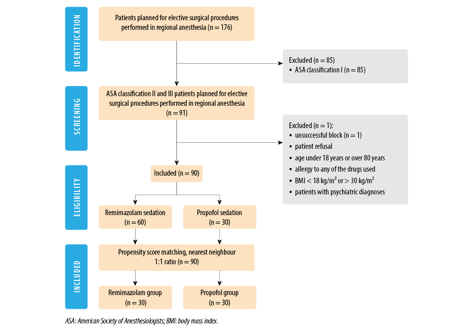 Demographic and clinical data were recorded on a standardized form (age, sex, height, and weight). Clinical data recorded before the start of the procedure were ASA status, bispectral index (BIS), Modified Observer’s Assessment of Awareness/Sedation Scale (MOAA/S), and Richmond Agitation-Sedation Scale (RASS). This observational study included a total of 90 patients: 60 patients were sedated with remimazolam and 30 with propofol [Figure 1]. Patients received no premedication. Standard intraoperative monitoring was applied and included noninvasive blood pressure, continuous electrocardiogram, and pulse oximetry (SpO2). The level of sedation was assessed using the MOAA/S scale, with values 2–3 representing moderate sedation, considered adequate for the successful implementation of the procedure.13 Additionally, the RASS scale was used as another validated tool for monitoring sedation depth, with target values ranging from -1 to -3.14 BIS served as a primary indicator of the depth of consciousness. All patients underwent surgery under spinal anesthesia. The procedures included infraumbilical orthopedic, vascular, and inguinal hernia repair surgeries. Spinal anesthesia was performed according to a standardized procedure, and after satisfactory sensory and motor changes were established, additional anesthesia monitoring (BIS) was set up and MOAA/S and RASS scores were assessed. BIS, MOAA/S, RASS scale, infusion speed and duration, systolic blood pressure, diastolic blood pressure, heart rate, and SpO2 were recorded every five minutes. Remimazolam and propofol induction doses, onset time of sedation, and time to recovery were noted. The total doses of remimazolam and propofol, as well as the total sedation time,