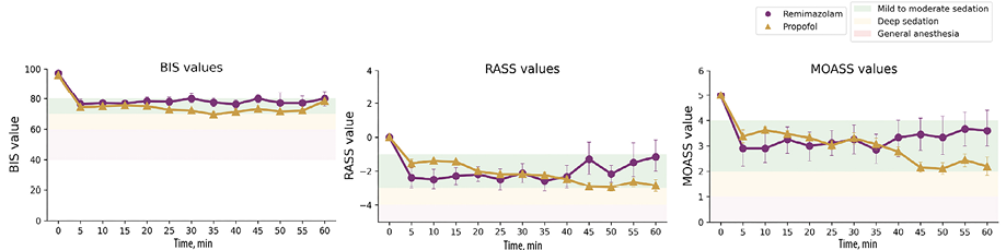 Figure 3: A comparison of achieved bispectral index (BIS), Richmond sedation scale (RASS), and Modified Observer’s Assessment of Awareness/Sedation Scale (MOAA/S) between remimazolam and propofol groups.