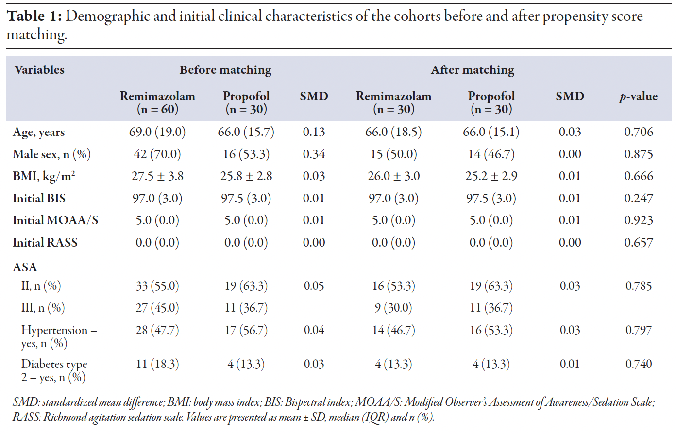 The required sample size was estimated based on the median recovery time, reported as 2.3 minutes (IQR = 1.8–3.3) for remimazolam and 5.0 minutes (IQR = 3.5–7.8) for propofol.16 Based on these medians and considering a significance level of 0.05 and a power of 80%, an estimated minimum necessary sample size of 10 participants per group we calculated. Normality of the distribution of variables was tested using the Shapiro-Wilk test. Continuous variables are shown as mean ± SD or median (IQR), as appropriate. To adjust for the confounding factors, a propensity score matching with optimal match without replacement and 1:1 nearest neighbor method with logistic regression distance was used. The matching demographic and clinical variables included age, sex, body mass index, ASA status, history of hypertension and diabetes, and initial BIS, MOASS, and RASS scores. The quality of the matching was assessed using the standardized mean difference where an absolute standardized mean difference of up to 0.1 was considered an excellent balance. In analysis after propensity matching, continuous variables are compared using t-test or Mann Whitney U test. Categorical variables were represented as number and corresponding percentage and differences tested with the chi-square test or Fisher’s exact test for frequencies < 5. For statistical analysis, Python (Centrum voor Wiskunde en Informatica, Amsterdam, the Netherlands) Statsmodels (v. 0.14.0), and ScyPy (v. 1.11.2) were used. Graphical representations were made using Python’s Matplotlib (v.3.5.2).17 The data associated with the paper are not publicly available but are available from the corresponding author on a reasonable request.