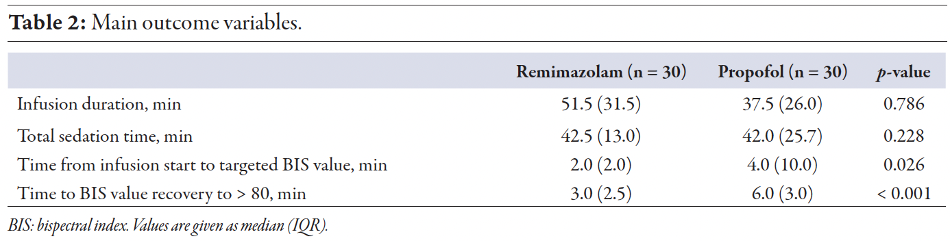 A key finding of this study is the recovery time of BIS values following continuous infusion, where median time after cessation of remimazolam infusion to achieve BIS values a > 80 was 3.0 min while for propofol group was 6.0 min (p < 0.001). Previous studies have shown that remimazolam and propofol have similar context-sensitive half-time, indicating only subtle differences in recovery time.18 However, in a study using remimazolam for continuous sedation during impacted third molar extractions, the time to spontaneous eye opening was 8.0 min, similar to our findings, despite a higher infusion rate of 0.40 mg/kg/h.19 A recent meta-analysis highlighted the fact that the reported time to recovery varies greatly.20 This meta-analysis, which included only studies on procedural sedation for short endoscopic procedures, also pointed out great discrepancy in results, attributed to the inclusion of various patient populations, different procedural durations and complexities, and a lack of reporting on relevant comparative safety or efficacy outcomes. Remimazolam does not exhibit cumulative sedative effects with increased duration of dosing up to nine hours under general anesthesia. However, changes in the infusion rate near the end of the procedure, difference in the BIS score at the end of infusion, and female sex can result in up to five minute differences in time to extubation.21 Although a three-minute difference in recovery time may appear small, it can be important in everyday clinical practice, especially in busy hospitals. In high-volume surgical settings, even small time savings can add up, helping operating rooms run more efficiently, reducing time in the post-anesthesia care unit, and keeping schedules on track. Faster recovery also allows patients to spend less time under sedation, which can lower the risk of complications such as airway problems or delayed return of protective reflexes, especially in older or high-risk patients. For outpatient procedures, quicker recovery can lead to earlier discharge and better patient flow. Overall, shorter recovery times help improve workflow, reduce the need for extended monitoring, lower sedation-related risks, and allow patients to return to normal activities faster, all of which contribute to better healthcare efficiency and patient satisfaction.