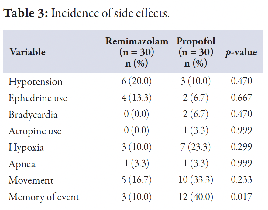 Regarding side effects, hypoxia was the predominant issue during propofol sedation, observed in seven (23.3%) cases, compared to three (10.0%) in the remimazolam group, but the difference was not statistically significant. Hypotension was the most prevalent side effect in the remimazolam group, occurring in six (20.0%) cases, compared to three (10.0%) in the propofol group, which was not statistically significant. There was no difference in the correction of hypotension with ephedrine between the two groups. Bradycardia was the least frequent side effect, observed only in two cases in the propofol group, with atropine used in only one case. No cases of bradycardia occurred in the remimazolam group [Table 3]. The only statistically significant difference between the two groups was in memory of the event, with 12 (40.0%) patients in the propofol group and three (10.0%) patients in the remimazolam group reporting retention of the experience during the procedure (p = 0.017).