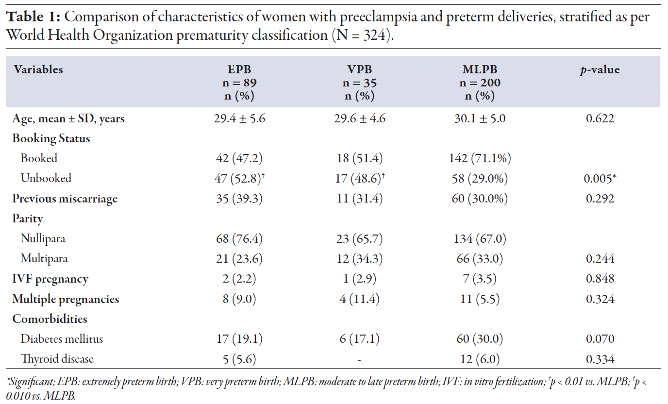 The participants comprised 324 women with preeclampsia, with mean age of 29.8 ± 5.1 years and who delivered between 24 and 36+6 weeks of gestation. Among them, 202 (62.3%) were booked, and 225 (69.4%) were primiparous. About one third (106; 32.7%) had a history of miscarriage and 23 (7.1%) had multiple gestations. The mean age, history of miscarriage, parity, and multiple pregnancies were not statistically significant across the groups. Ten (3.1%) women conceived through in vitro fertilization, with no significant difference among the groups (p = 0.848). The rate of unbooked cases was significantly higher in EPB as compared to MLPB (p < 0.010). The most common maternal comorbidities were diabetes mellitus (25.6%) and thyroid disease (5.2%) [Table 1].