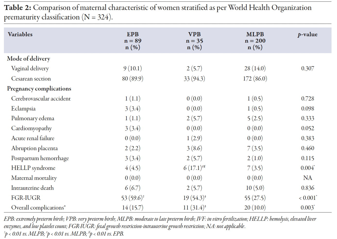 Although both EPB and VPB groups had higher incidence of early-onset preeclampsia, the VPB group showed twice the rate of maternal complications. This apparent paradox likely reflects a more interventionist approach in the EPB group, where gestational age < 28 weeks shifts the priority to maternal well-being due to the poor fetal prognosis.4 After 28 weeks, the priority changes to prolonging pregnancy to improve fetal survival, unless maternal or perinatal risk becomes imminent.4 Pakistan’s high maternal mortality rate (186 per 100 000 live births) may further contribute to the risk.14 Perinatal outcomes are also poorer than in other low and middle-income countries, with a neonatal mortality rate of 41 per 1000 live births.15, 16