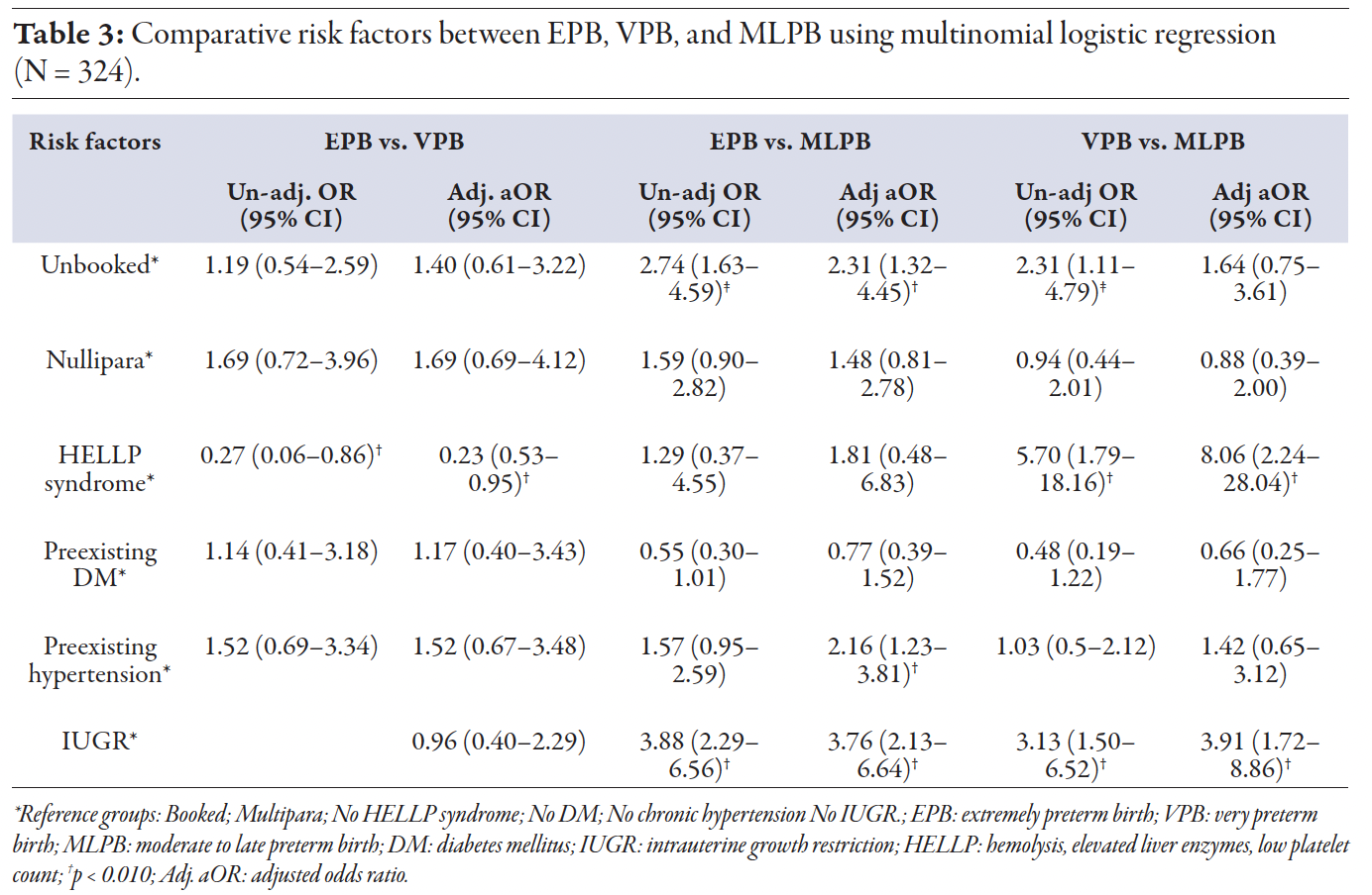 Table 2 compares maternal characteristics and complications between the groups. FGR-intrauterine growth restriction was diagnosed in 127 (39.2%) participants. The rate of intrauterine growth restriction was significantly higher in women with EPB (59.6% vs. 27.5%; p < 0.01) and VPB (54.3% vs. 27.5%; p < 0.01) as compared to MLPB, with no significant difference between EPB and VPB. A total of 45 (13.9%) women developed serious maternal complications, including eclampsia, pulmonary edema, abruptio placenta, postpartum hemorrhage, and hemolysis, elevated liver enzymes, and low platelet count (HELLP) syndrome. The overall rate of complications was significantly higher in the VPB group than in the MLPB group (31.4% vs. 10.0%; p < 0.010). HELLP syndrome was significantly more prevalent in the VPB group than in the EPB (17.1% vs. 3.5%; p < 0.010) and MLPB (17.1% vs. 4.5%; p < 0.010). IUD occurred in 18 (5.6%) cases with no significant differences across groups. Unadjusted and adjusted odds ratios for independent risk factors were investigated using multinomial logistic regression analysis. HELLP syndrome was the most critical risk factor in the VPB group. IUD was identified as a significant risk factor in EPB and VPB compared to MLPB in univariate and multivariate analyses after controlling the effect of booking status, parity, HELLP syndrome, diabetes, and preexisting hypertension [Table 3].
