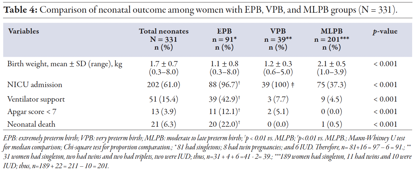 Most 285 (87.9%) women underwent cesarean sections, while a minority (39; 12.0%) had vaginal deliveries, resulting in 331 neonates, including twins and triplets. Based on gestational age at delivery, women were classified into EPB = 89 women (27.5%; 91 neonates); VPB = 35 women (10.8%; 39 neonates); MLPB = 200 women (61.7%; 201