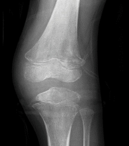 Figure 1: X-ray image of the left knee showing heterogeneous lucencies of the distal femoral metaphysis, proximal tibial metaphysis, and proximal fibular metaphysis with diffuse erosions.