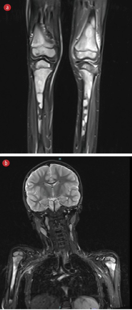 Figure 2: Details from the whole-body MRI. Multifocal heterogeneous areas of T2 hyperintensity affecting mainly the long bones (epiphysis, metaphysis, and diaphysis, with affinity to metaphysis). Also, periosteal elevation and surrounding soft tissue edema at the distal left femur and proximal left tibia, with focal thinning of the cortex of the tibia. Small joint effusion of the left knee. The brain parenchyma is unremarkable.