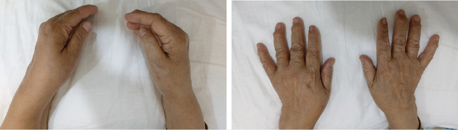 Bilateral hand examination revealed tenderness over the Heberden and Bouchard nodes and restricted and painful hand movements [Figure 1]. On wrist examination, swelling over the medial carpometacarpal joints, severe tenderness, and restriction of movements were noted. Joint effusion was present in both knees.