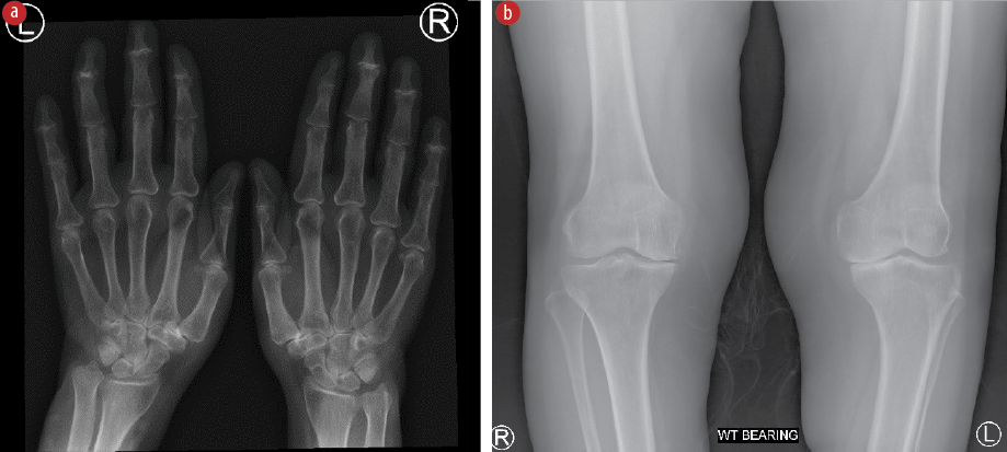 Figure 2: (A) X-ray image of hands and wrists showing reduced joint space with degenerative changes in proximal and distal interphalangeal joints of the hands, and trapeziometacarpal joints. (B) X-ray of the knees showing reduced joint spaces and degenerative changes in the medial tibiofemoral joints.