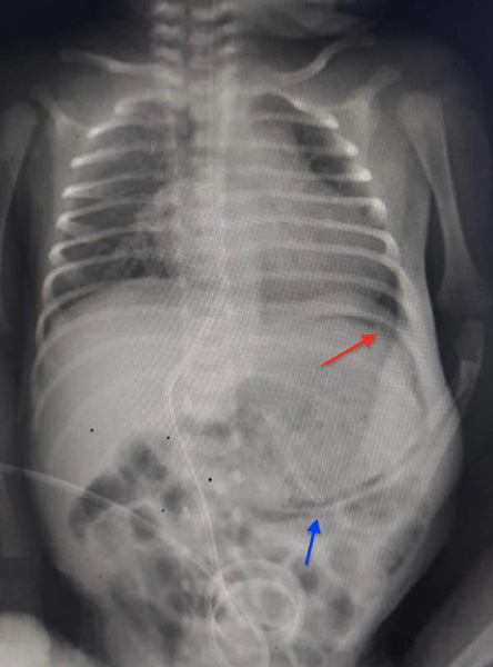 Figure 1: The initial anteroposterior abdominal radiograph of the newborn with an umbilical venous catheter in situ. Curvilinear gastric pneumatosis is seen (red arrow). The gavage tube is abutting the gastric wall (blue arrow).