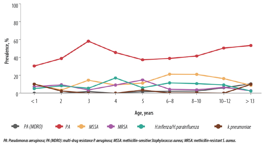 MDR P. aeruginosa, defined as P. aeruginosa that is not susceptible to ≥ 1 agent in ≥ 3 classes of antimicrobials, is an emergent challenge among the CF population. In our study, it was more prevalent in patients ≥ 13 years (10.5%). Among all positive cultures, MDR P. aeruginosa accounted for 3.7%, which is comparable to the 3.5% reported in the CFFPR-2021.17
