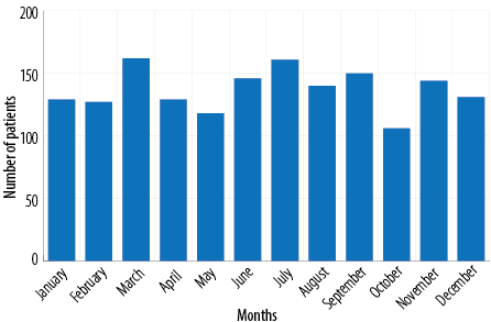 Figure 2: Distribution of pediatric trauma patients by months over study period.