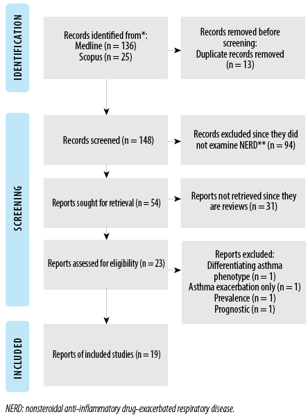 Two authors (ENN and AABW) search the electronic databases MEDLINE and Scopus. The search was conducted without date and language limitations. The search algorithm applied in the free text was: NSAID-exacerbated respiratory disease OR aspirin-exacerbated respiratory disease OR aspirin-sensitive asthma OR aspirin-induced asthma OR Samter’s triad OR aspirin triad OR Widal’s triad AND (risk OR ratio.