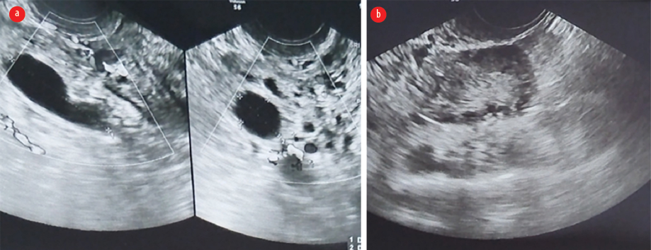 Figure 1: (a) Emergency ultrasound image showing tubular, anechoic, hydrosalpinx with surrounding increased echogenicity, heightened vascularity, and (b) polycystic right ovary with no features of torsion.