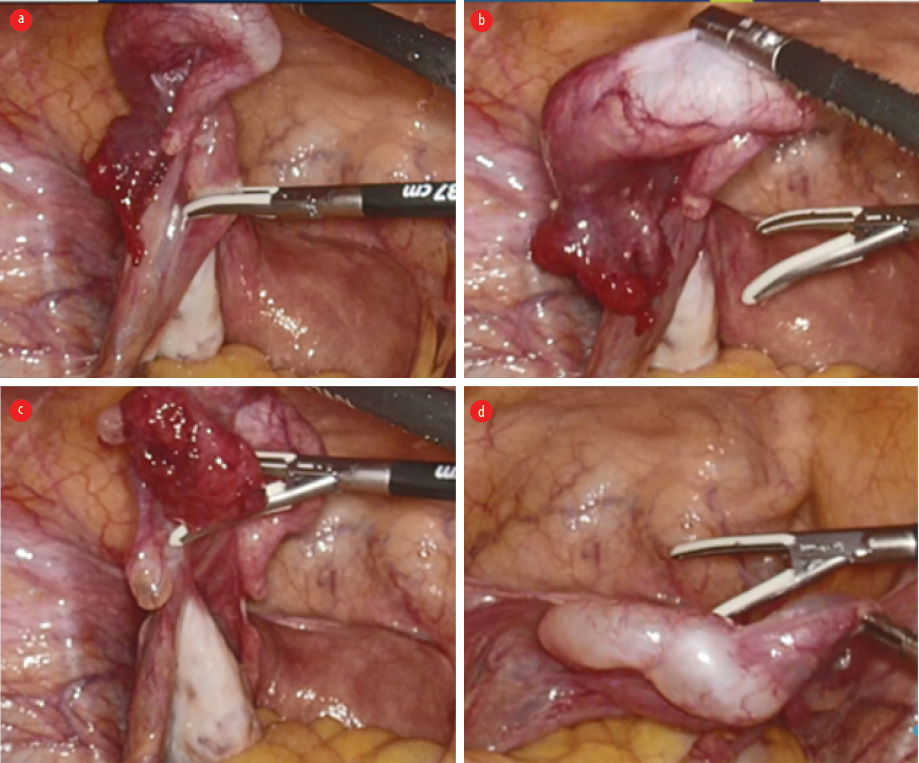 Figure 2: Laparoscopic intraoperative images showing (a) torsed fallopian tube and mesosalpinx, (b) partial detorsion of dilated fallopian tube, (c) partial detorsion of mesosalpinx, and (d) fully detorsed mesosalpinx with hydrosalpinx.