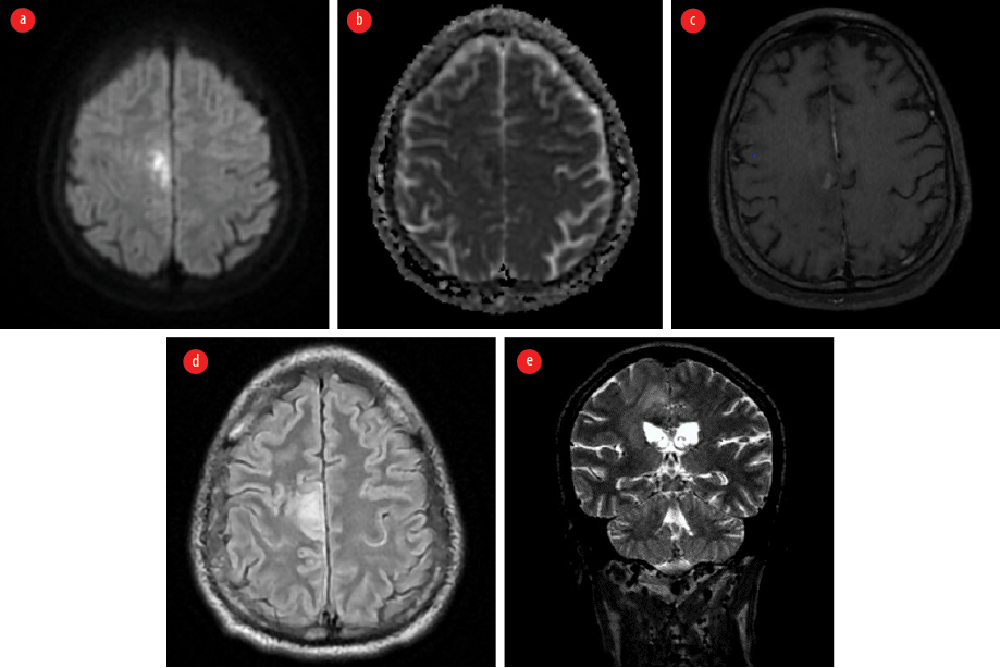 Figure 1: Contrast-enhanced MRI of the brain taken on the first visit. (a) Axial diffusion-weighted image shows areas of diffusion restriction in the right frontoparietal cortex. (b) Corresponding apparent diffusion coefficient map indicates the hypointense areas in the involved region. (c) Axial post contrast T1 image shows patchy contrast enhancement in involved area. (d) Axial T2 fluid attenuated inversion recovery image reveals the surrounding edema. (e) Coronal T2 image shows the edema extending to the thalamocapsular region.
