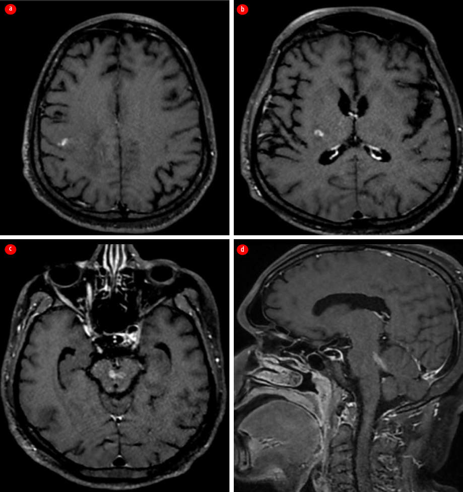 Figure 3: Contrast-enhanced MRI of the brain taken following the first relapse. (a) Axial section shows irregular streak-like enhancing areas starting at the right prefrontal gyrus; (b) Axial section shows extension of enhancement along the right posterior limb of the internal capsule. (c) Axial section shows involvement of the midbrain with crossing of the midline. (d) Sagittal section indicates entry into the cerebellum via the left superior cerebellar peduncle.
