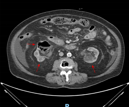 Figure 1: Contrast-enhanced CT image of the abdomen and pelvis showing bilateral renal abscesses (red arrows) and right-sided emphysematous pyelonephritis. Dashed arrow indicates the location of gas within the right renal pelvicalyceal system.