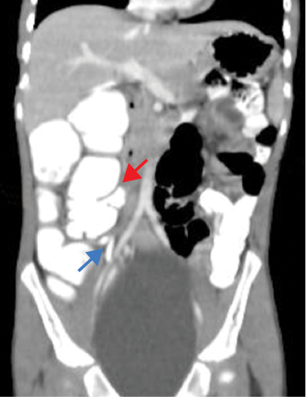 Figure 1: Coronal sections of the contrast-enhanced computed tomography scan of the abdomen, showing the abnormal positioning of the small bowel loops on the left side (red arrow), and the large bowel loops on the right side (blue arrow), suggesting the possibility of hindgut malrotation.