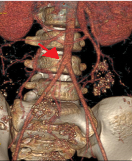 Figure 3: 3D volume-rendered contrast-enhanced computed tomography arterial phase images showing the abnormal right-sided course of the inferior mesenteric artery (red arrow).
