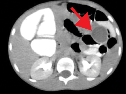 Enteric duplication cysts are rare congenital malformations of the intestinal tract closely attached to the gut wall, lined with intestinal epithelium.9 Complications include recurrent abdominal pain, intussusception, obstruction, and bleeding.10 Ultrasound typically shows a cyst in relation to the gut, with a double-wall gut signature.9 CT and magnetic resonance imaging can depict the location and extension of the cyst, complications, associated anomalies, and anatomical relationships.10