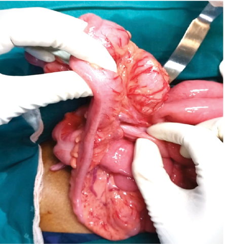 A diagnosis of isolated hindgut malrotation associated with an enteric duplication cyst was suggested. Surgical findings confirmed the diagnosis, with the colonic loops lying on the right side of the abdomen and small bowel loops on the left side. A tubular duplication cyst was observed along the distal jejunum and proximal ileum. An additional and interesting finding was that the ascending colon had mesentery, and there was a defect in the ascending colon mesentery, through which the terminal ileum, ICJ , cecum, and appendix were herniating [Figure 5]. The ascending colon was also noted to be twisted along its vascular axis. The twisted portion of the ascending colon was resected and the remaining ends were re-anastomosed. The position of the ICJ junction and terminal ileum was corrected. A part of the small bowel loop, specifically the distal jejunal-proximal ileal loops containing the duplication cyst, was excised [Figure 6].