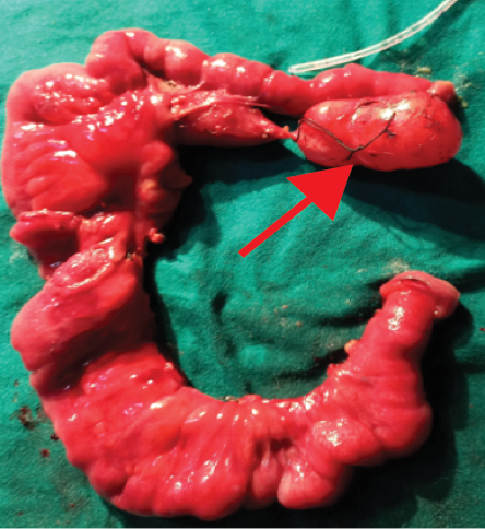 Figure 6: Resected surgical specimen of small bowel and the associated intestinal duplication cyst (along the mesenteric border). Arrows show the duplication cyst.