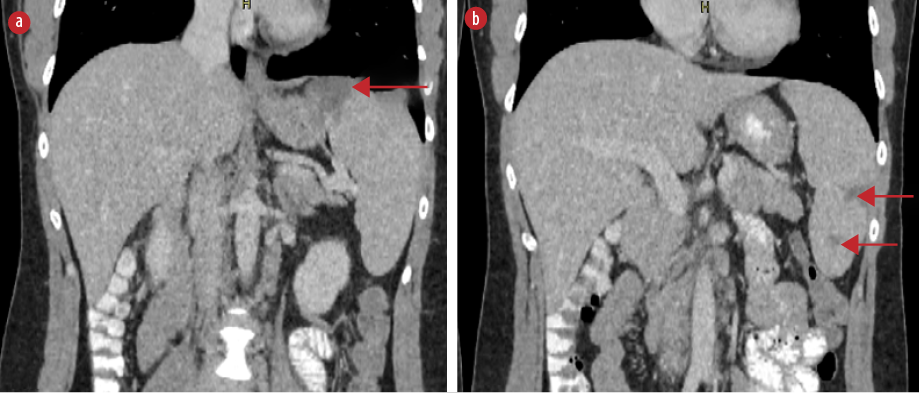 Figure 2: Coronal abdominal CT scan with intravenous contrast demonstrating multiple splenic infarcts (red arrows), (a) located at the superior, as well as (b) the middle and lower parts of the spleen.