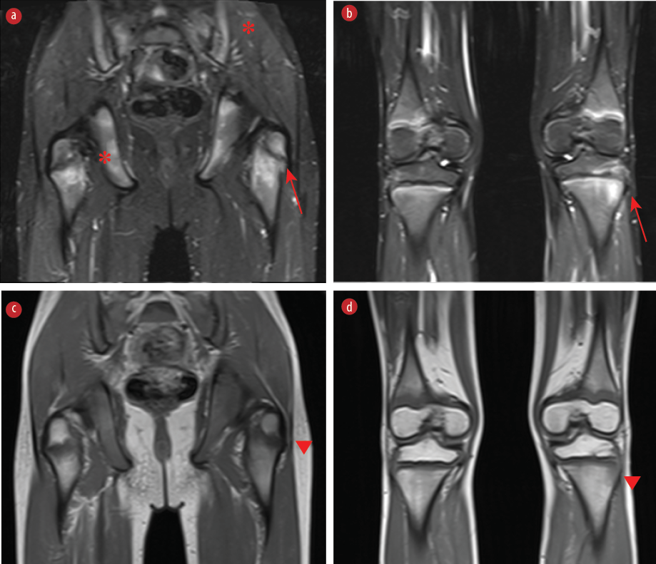 Figure 1: Coronal MRI images of the pelvis/proximal femur, distal femur and proximal tibia. (a, b) Edema is seen in the periphyseal regions of the femur and tibia on short-tau inversion recovery images (red arrows). (a) Asymmetric involvement of the pelvic bones and sacroiliac joints (*) is also present. (c, d) Corresponding low-signal changes are noted on T1-weighted images (arrowheads).